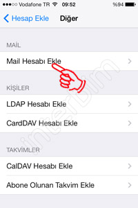 5) Açılan "Diğer" menüsününden "E-postalar" bölümünün altında bulunan "Mail Hesabı Ekle" menüsüne dokunuyoruz.