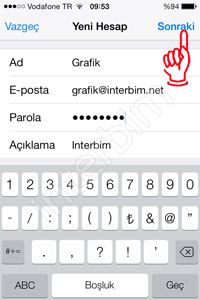 6) Açılan "Yeni Hesap" bölümünde bulunan Ad, E-posta, Parola, Açıklama kısımlarını dolduruyoruz. Bilgileri doğru ve eksiksiz doldurduysak "Sonraki" düğmesine dokunuyoruz.