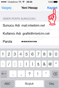9) Aynı ekranda bulunan "Giden Posta Sunucusu" bölümünü de dolduruyoruz. Bilgiler "Gelen Posta Sunucusu" ayarlarıyla aynıdır. Kaydet düğmesine dokunuyoruz.