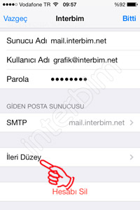 8) Daha sonra "Gelen Posta Sunucusu" bölümünün altında bulunan Sunucu Adı, Kullanıcı Adı, Parola bilgilerini giriyoruz. Sunucu Adı kısmını mail.sizindomainadresiniz.com şeklinde doldurulmalıdır. İnterbim müşterileri için Kullanıcı Adı e-posta adresleridir.