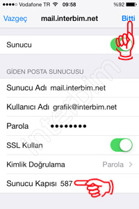 17) Açılan sayfada "Giden Posta Sunucusu" bölümünün altında bulunan "Sunucu Kapısı" değerini "587" olarak değiştirip "Bitti" düğmesine dokunuyoruz. Bu adımla beraber e-posta kurulumunuz gerçekleşmiş olacaktır. Artık e-posta alıp gönderme işlemlerinizi iOS 7 işletim sistemine sahip IPhone'nunuzdan yapabilirsiniz.